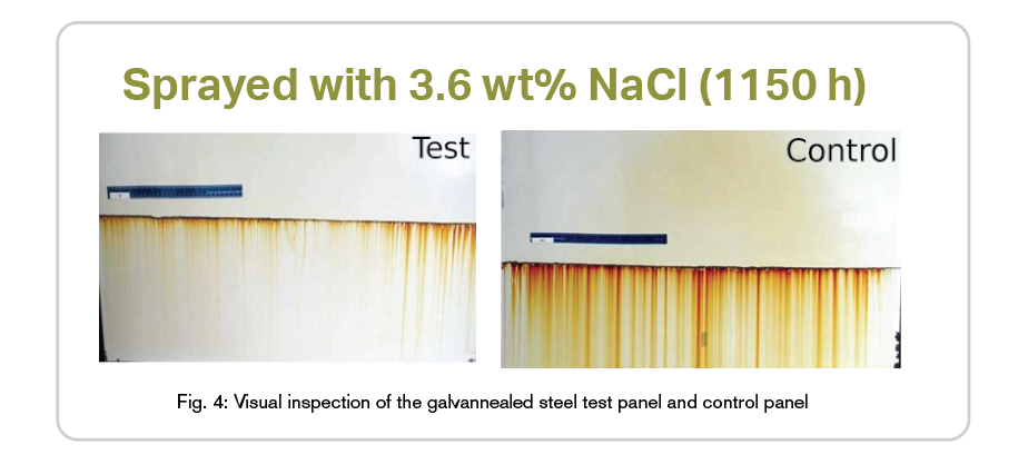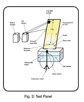 The scribed surfaces of the panels were continuously sprayed with a 3.6 wt.% NaCl (salt) solution to simulate road salt exposure. Only the surface of the panel in the vicinity of the scribe, and the surface below, was inundated with the electrolyte; the remainder of the panel surface remained dry. In fact, the distance between the top of the spray zone and the location where the Module was connected to the Test Panel was approximately 2 feet showing that any possibility of a return electrolyte path can be discounted.